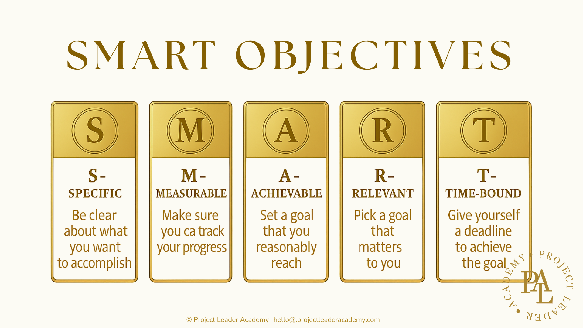 - Write down 3–7 agreed objectives that reflect result, money, and time and share them with everyone involved.